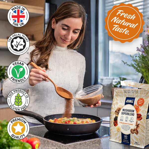 Applied Nutrition’s Mushroom Superblend is a combination of 8 of the most powerful mushrooms to support your overall health, immunity and vitality. Our unique mushroom blend is the perfect way to boost your immune health, cognitive abilities, stress management, digestive health and improved energy levels, naturally and effectively. Our mushroom extract powder can be added without any preparation to smoothies and soups, or sprinkled on foods. Alternatively, add 1 level teaspoon to your favourite hot drink. Stir well.